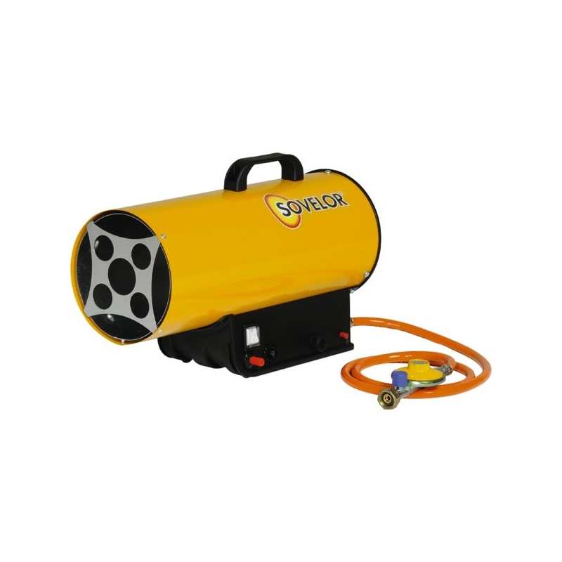 Utilisation intérieure et extérieure dans des locaux bien ventilés. Combustion directe. A commande manuelle. Équipé d'une sécurité de surchauffe, d'une sécurité stop-gaz, de 2 grilles de protection sur l'aspiration et le soufflage et d'un contrôle de flamme par thermocouple. Puissance réglable par vanne. Se fixe directement sur une bouteille de gaz propane. Puissance calorifique : 18 à 33 kW Alimentation : 230 V Débit d'air : 1000 m³/h Poids : 8 kg Tuyau souple, manodétendeur gaz, câble et prise électrique inclus.