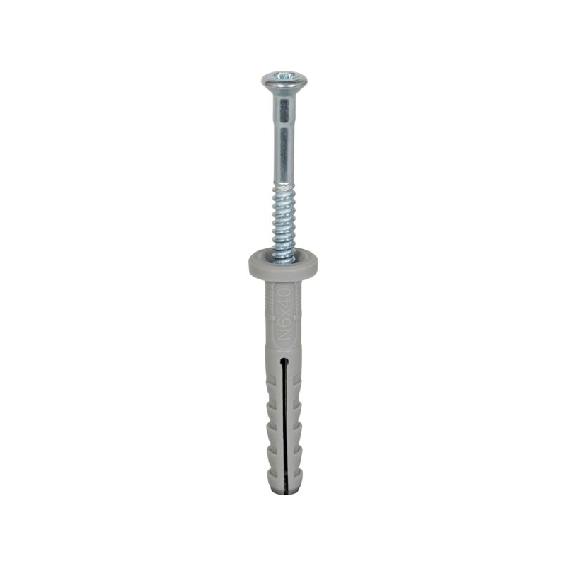 Cheville en nylon à collerette large et épaisse, clou en acier électrozingué. Tête de vis empreinte Pozidriv®. Pour fixer lattes, chevrons, encadrements, profilés, goulottes. À utiliser dans béton, parpaings pleins et béton cellulaire. Boîte de : 100