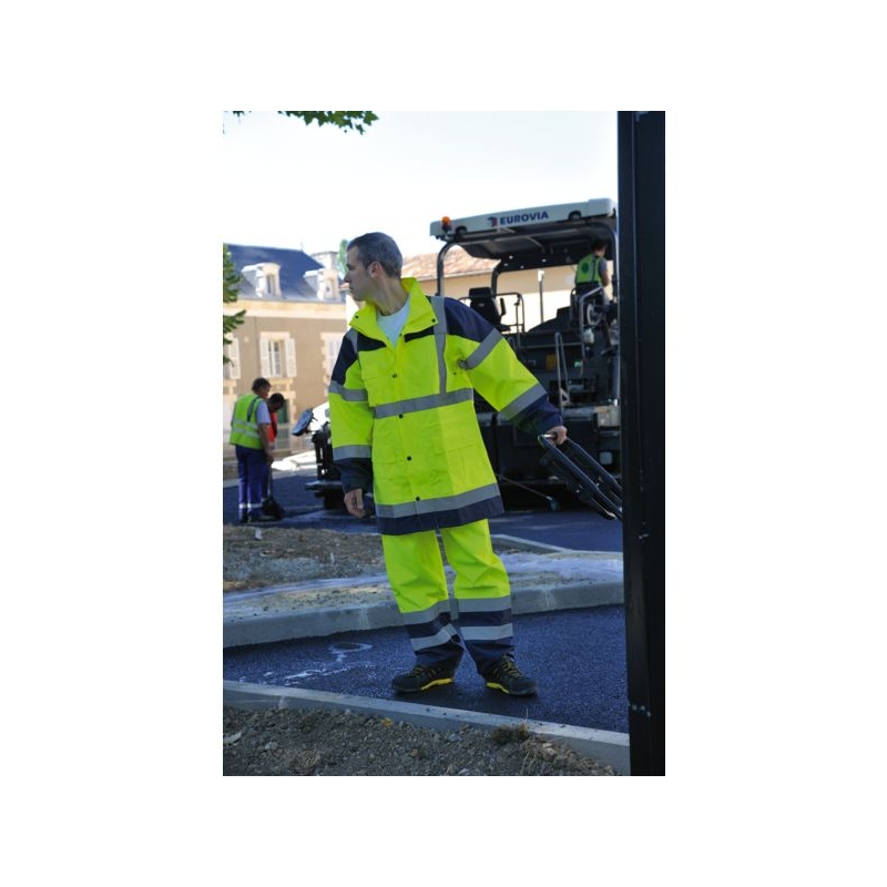 100% polyester Oxford 300D enduit PU. Veste : Bandes rétroréfléchissantes 2 horizontales, 2 brassards et bretelles, coutures étanchées, doublure filet, 2 poches basses, 1 poche poitrine téléphone. Capuche fixe enroulée dans le col avec vision latérale, fermeture centrale à glissière sous rabat pressions, poignets réglables. Pantalon : 2 bandes rétroréfléchissantes, serrage élastique à la taille, braguette. Coloris : jaune fluo/bleu marine, orange fluo/bleu marine Taille : M à XXL Norme : CE Cat II - EN ISO 20471 (3) pour la veste - EN ISO 20471 (1) pour le pantalon - EN 343 (3.1)