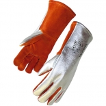 Paume cuir tout croute de bovin, avec traitement retardateur de flamme. Montage coupé cousu. Type américain. Pouce palmé. Dos du gant et des doigts en cuir croûte naturelle recouverte d’un tissu aluminisé. Cousu fil para-aramide. Entièrement doublé d’un molleton en coton. Manchette doublée d’une toile coton. Risque chaleur et/ou feu Manutention lourde / Milieu sec Applications métiers : soudage manuel, métallurgie, sidérurgie, démoulage de pièces, travaux à proximité des fours Taille : 9 et 10 Norme : CE Cat II - EN 388 (4133X) - EN 407 (41224X) - EN 12477 type A