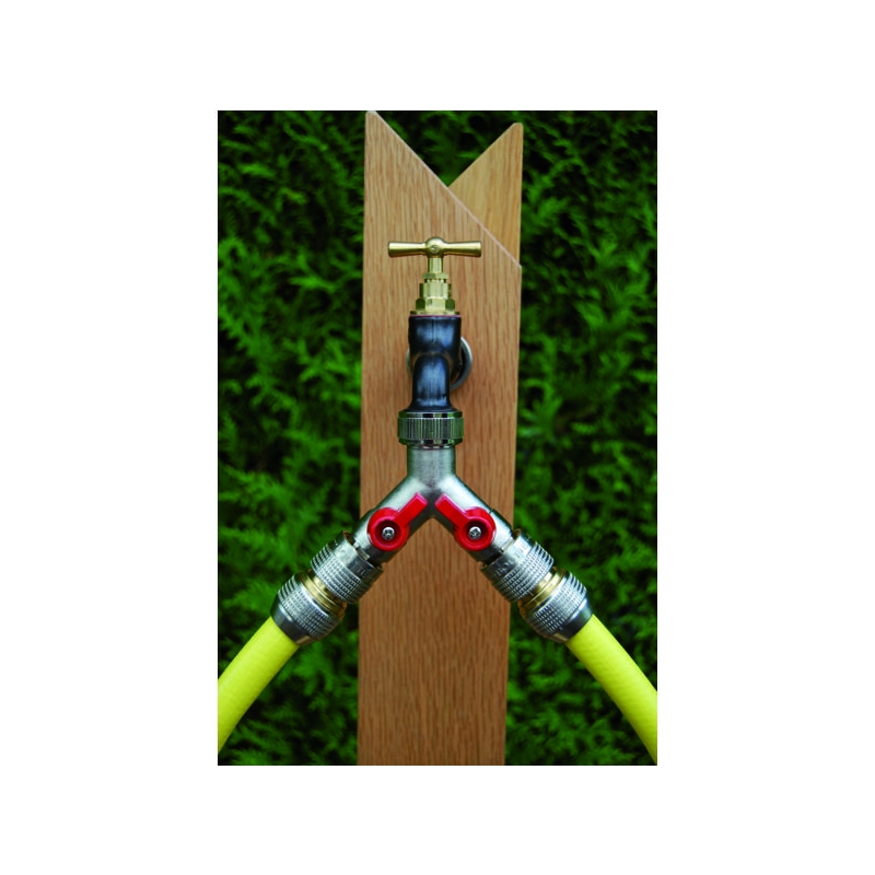 Avec arrêt 1/4 tour. Entrée écrou mobile femelle : 20 x 27 mm 2 sorties mâles : 20 x 27 mm