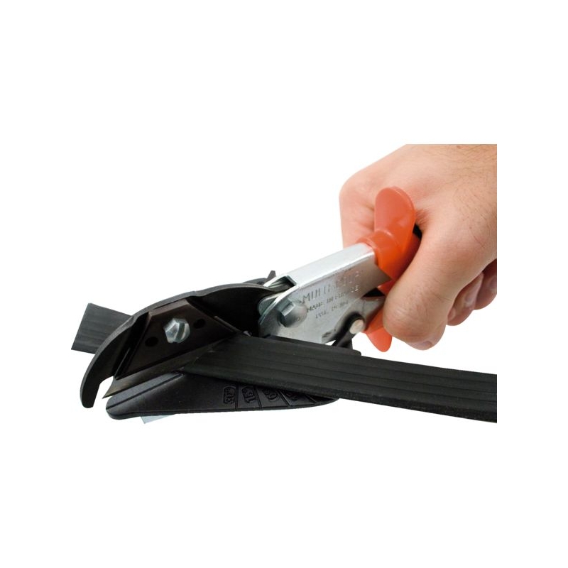 Coupe de 0 à 45° sans déformation. Coupe nette, rapide et sans effort. Lame trapèze interchangeable. Idéale pour la coupe de profilés plastiques, joints caoutchouc de vitrerie, moulures décoratives, profilés de finition de carrelage, bandes PVC. Platine angle graduée, lame cutter réversible de 56 mm.