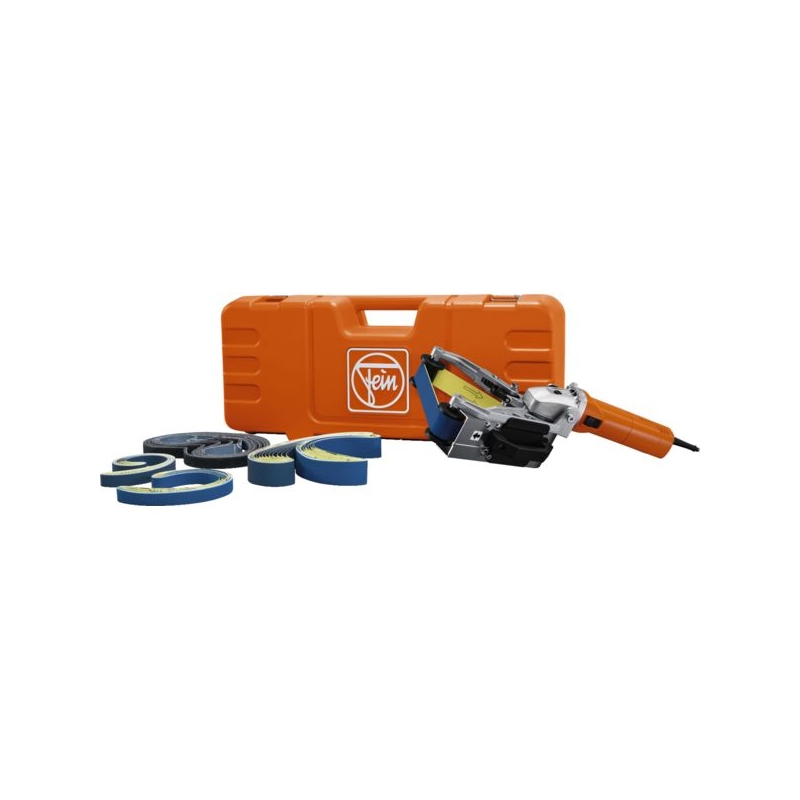 Pour le ponçage de tubes droits ou coudés de 8 à 80 mm. Vitesse réglable en continu pour le polissage, brossage et satinage des aciers inox. Largeur de bande : 20 mm Longueur de bande : 815 mm Puissance : 1700 W Vitesse : 2700-8500 tr/mn Vitesse de la bande : 9-27 m/s Poids : 4,300 kg Livrée en coffret avec 10 bandes largeur 20 mm P120 et P180, 10 bandes largeur 40 mm P120 et P180, et 5 bandes abrasives fibres grains fins.