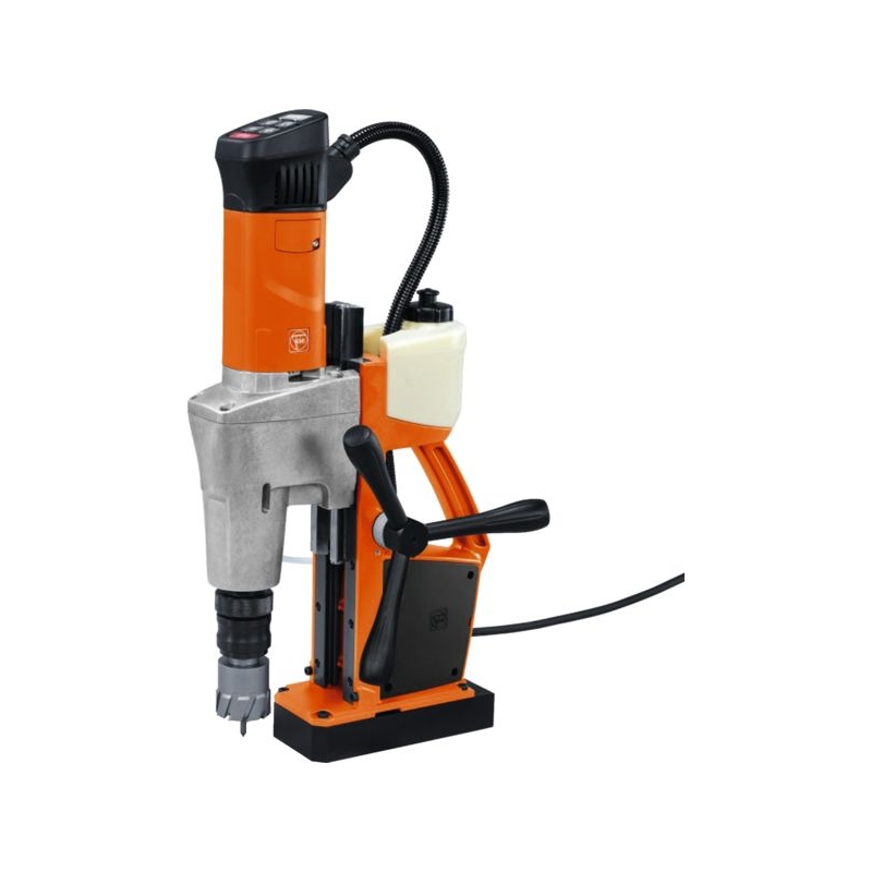 Commande sur clavier ergonomique et simple. Changement rapide de l'outil QuickIN. Alimentation : 230 V Puissance : 1200 W 2 vitesses de rotation : 130-260 et 260-520 tr/mn Capacité de perçage : - fraise carbure QuickIN max. : 50 mm - fraise HSS max. : 40 mm - foret HSS CM3 : 23 mm Profondeur de perçage : 50 mm Force d'attraction magnétique : 12500 N Poids : 13,900 kg Livrée en coffret avec réservoir pour lubrifiant, sangle de sécurité, crochet à copeaux, éjecteur, grille de protection contre les copeaux, chasse-cône.