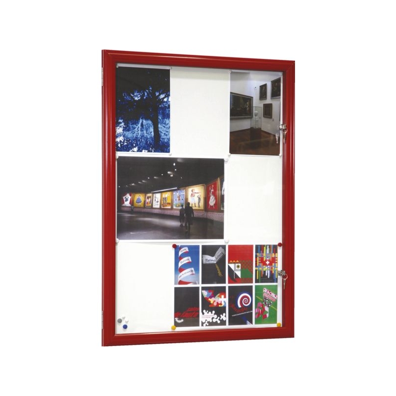 Vitrine réversible avec fond tôle laquée électrozinguée (affichage magnétique). Porte battante démontable avec charnière inox. Encadrement aluminium anodisé, façade verre Sécurit 4 mm. Fermeture par serrure dans le vitrage. Fixation murale 4 points. Épaisseur hors-tout : 35 mm Épaisseur utile : 21 mm Existe en noir, gris et rouge.